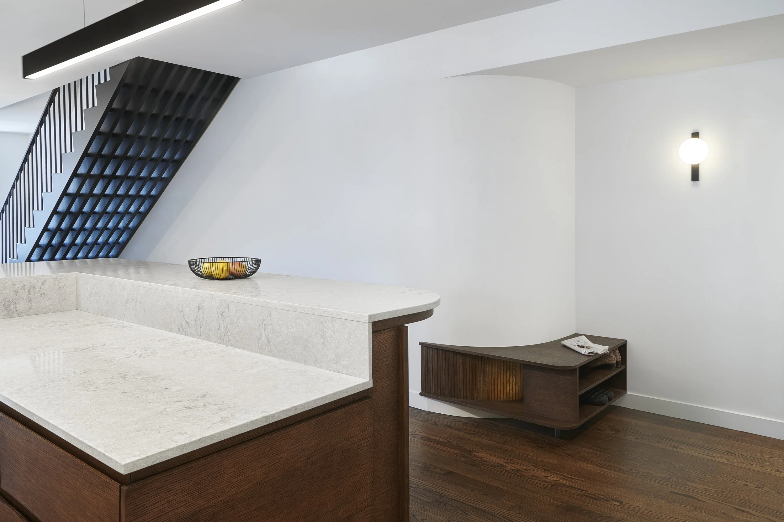 A duplex on the second and third floors of a residential apartment building in Gramercy Park, this project is a newly renovated home to a family of four. The street corner apartment comes with a great number of South-East facing windows bringing in a welcoming amount of natural light throughout the day. The wish for a newly configured entrance area in combination with an open kitchen layout and optimized storage solutions would start the conversation about the overall desired transformation of this home.