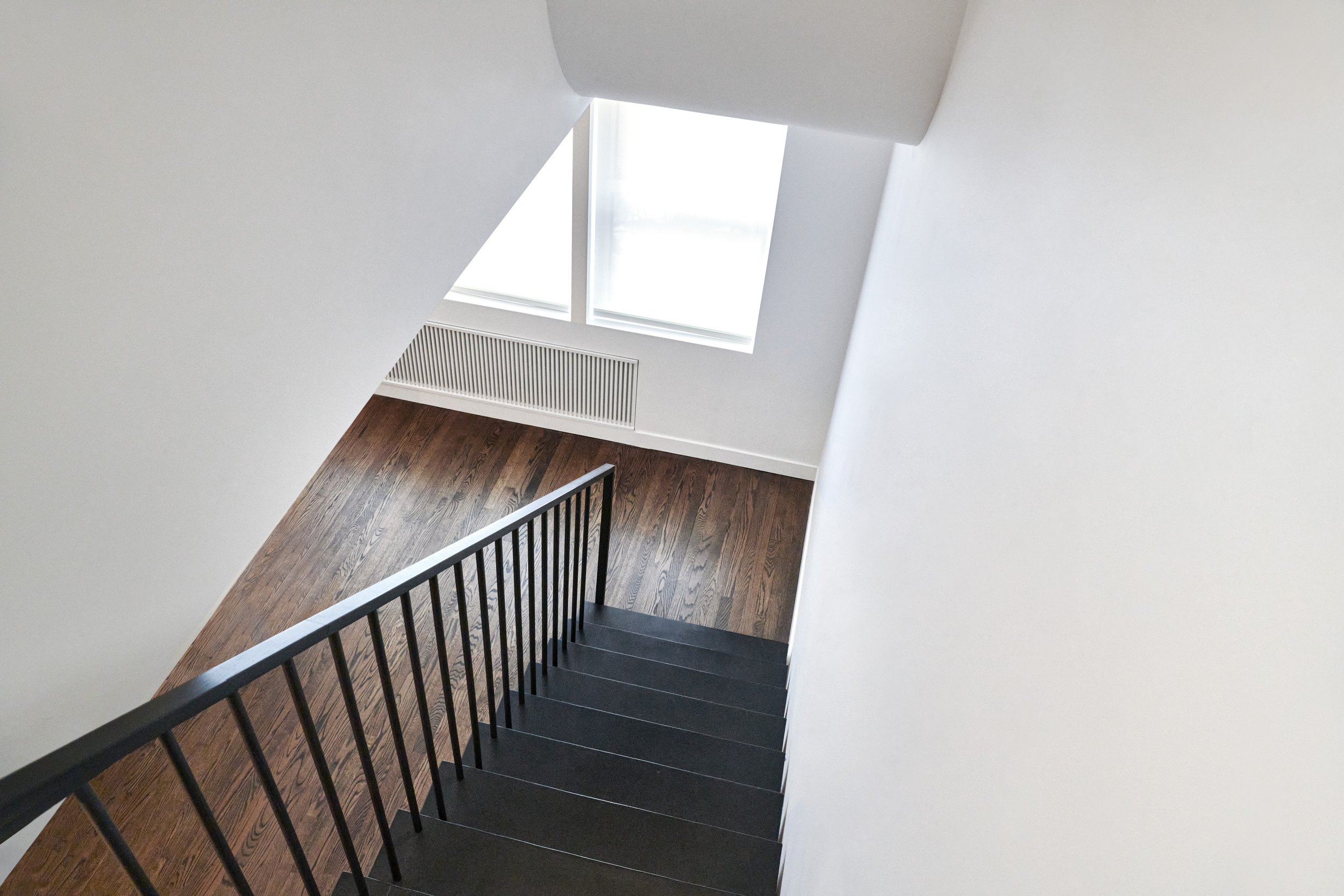 Existing materials like the floor and stair were kept, newly interpreted and refinished. The stair received a new balustrade and handrail. Complimenting materials and finishes were added for a series of built-in architectural millwork and radiator enclosures. Next to the bedrooms, the family’s main bathroom was reconfigured favoring a larger walk-in shower and a smaller soaking type tub.