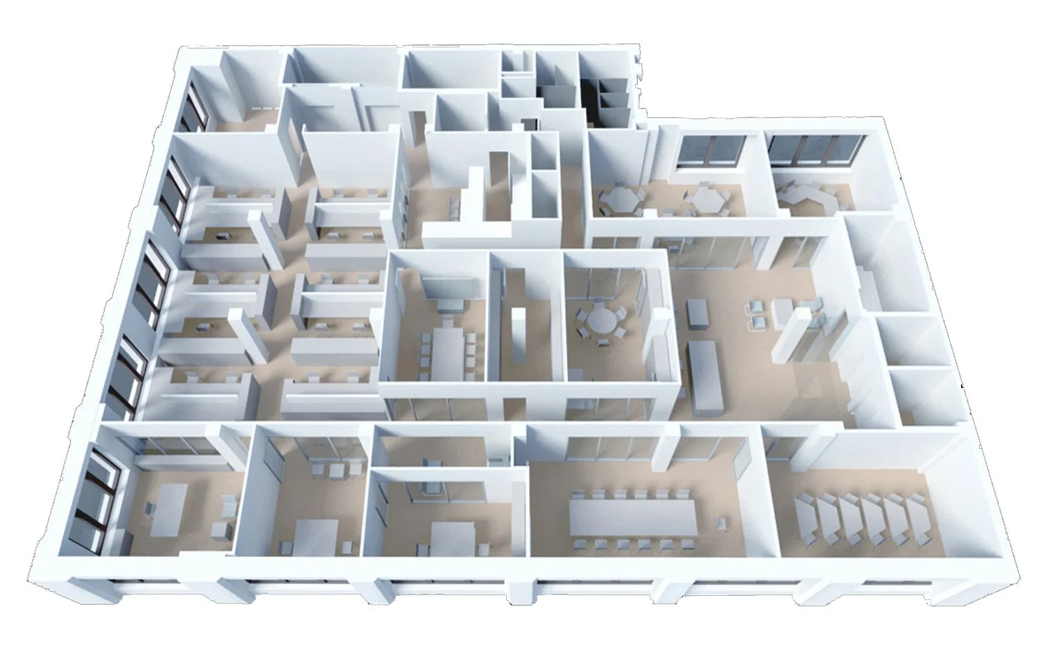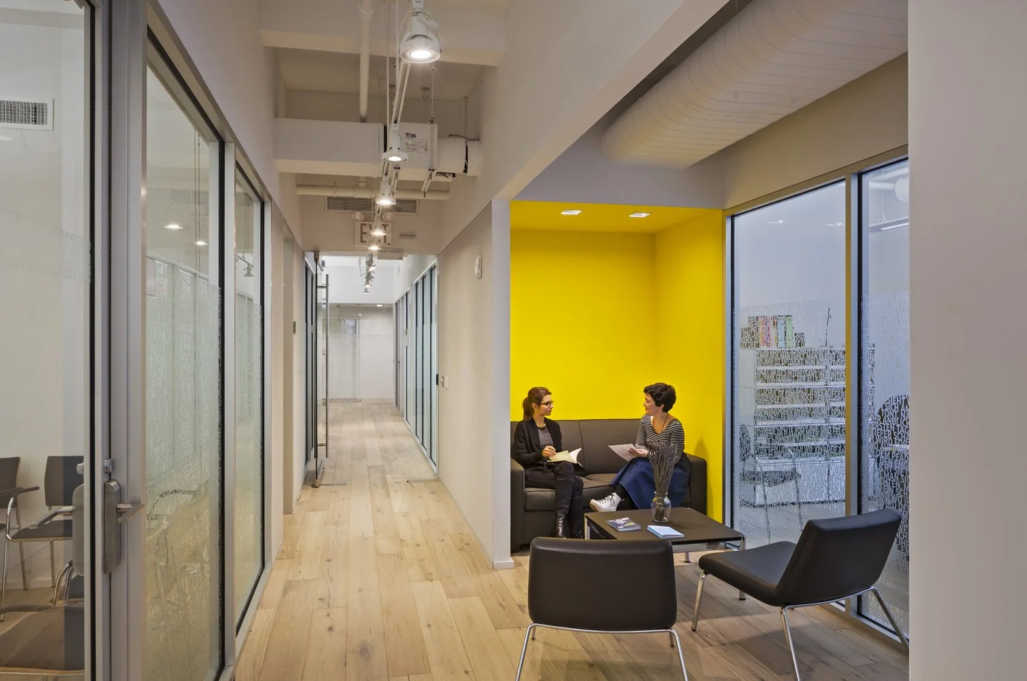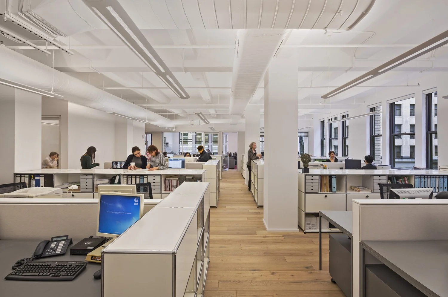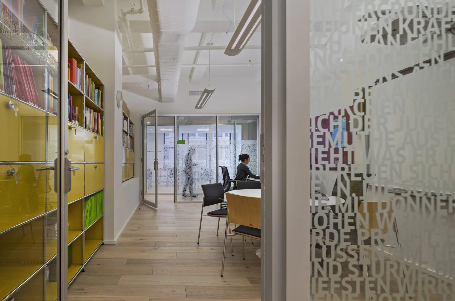 Design and construction of a 8,000 sf commercial interior in a 1910 loft building, to house the administrative offices and language school of a German Cultural Center. Under a challenging fast track schedule this project had to combine daytime office use and nighttime adult education into one continuous light flooded space. While granting security between those two functions, a generous feel was created through glass fronts bringing daylight into the depth of the floor, and a reduced, light material and color palette across the entire floor plate.