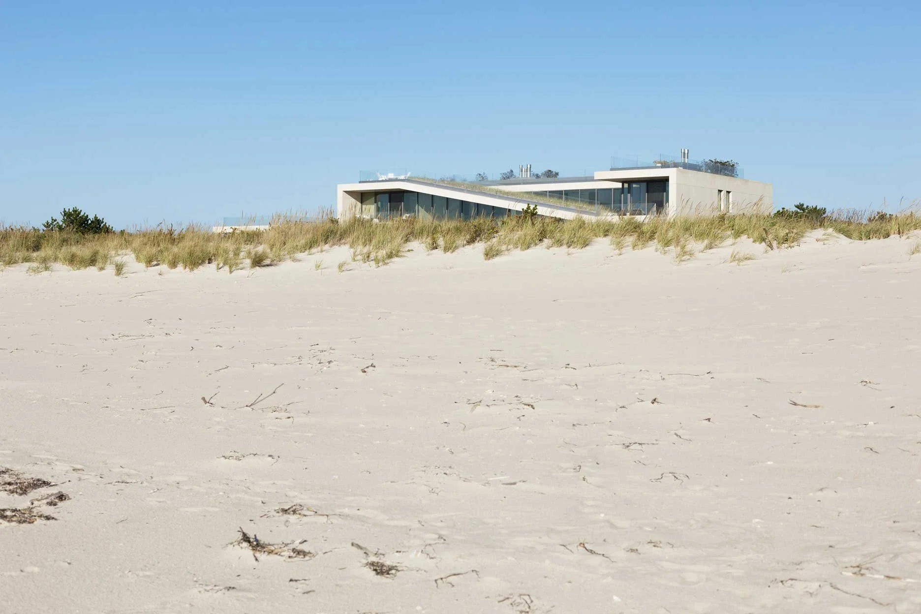 Situated on the eastern shore of Long Island, NY, this summer house emerges out of the dunes of an 'endless' Atlantic Ocean beach. Its disciplined material language is directly derived and inspired by this marine setting, and its Gestalt is a modern transformation of it. The main material is a buff colored dolomitic limestone cladding all exterior surfaces and interior ground floor perfectly blending in with the color of dune and beach.