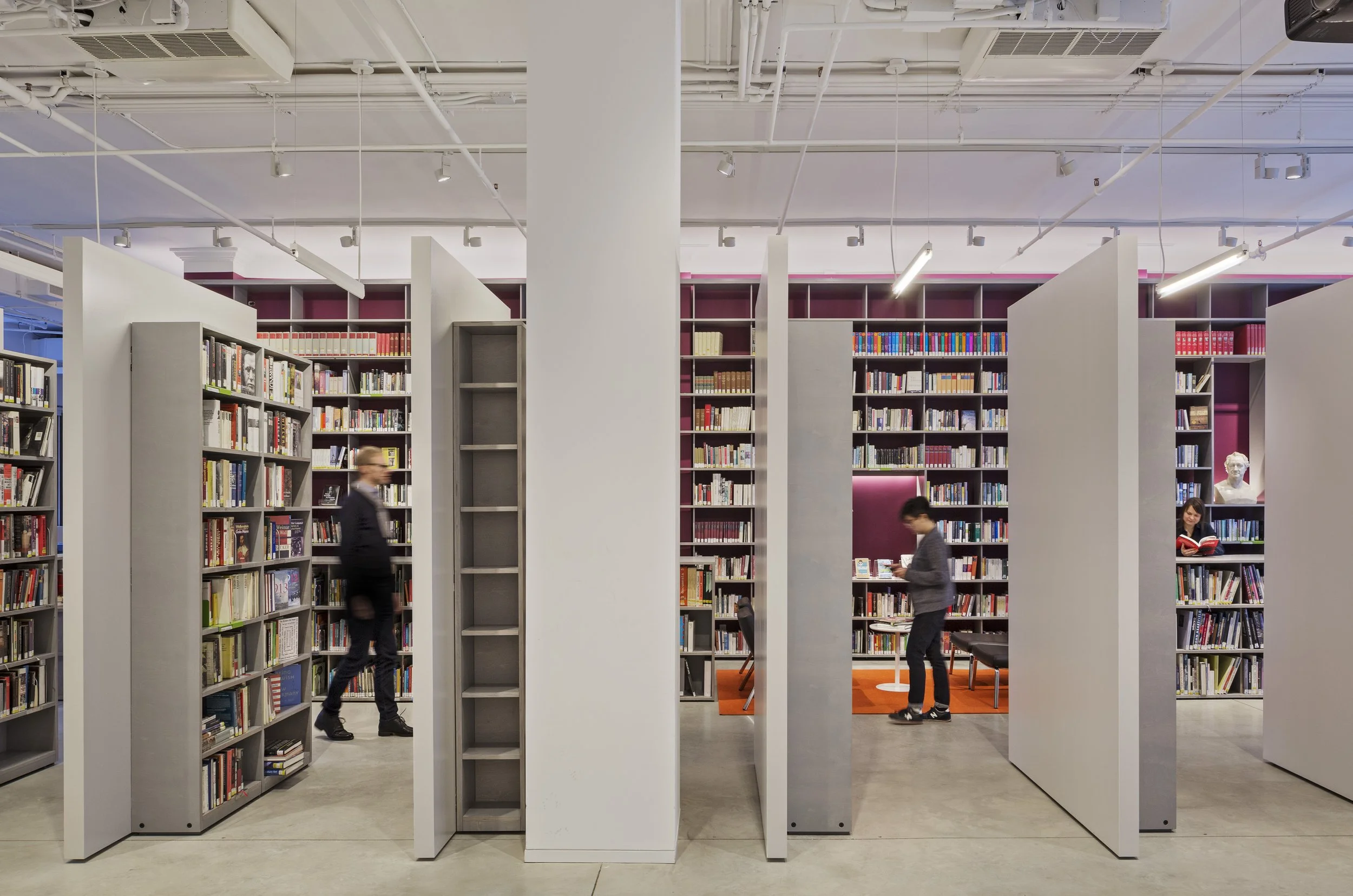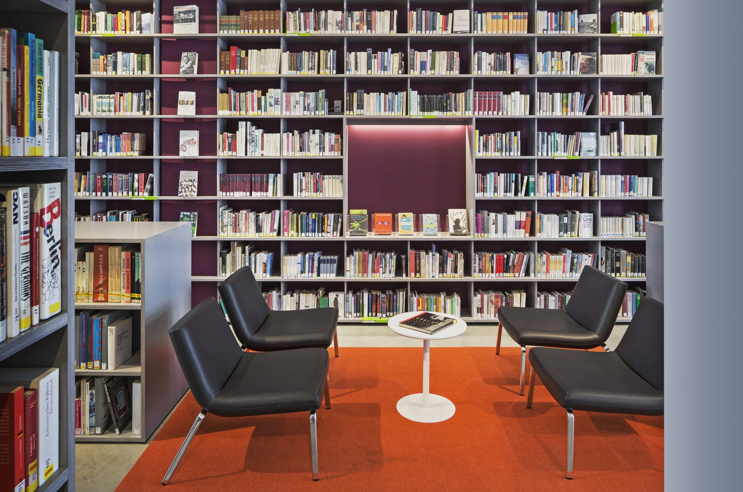 KARO developed a flexible library furniture system that provides permeable boundaries between the departments and can be adjusted to serve different events and scenarios. The library can be compressed and expanded as needed to create space around the bar counter for post function gatherings. The pantry's countertop grows into a generous study counter with network access and views into the tree filled interior of the city block. The same counter, lined in stainless steel, can also be used to hold a grand buffet.